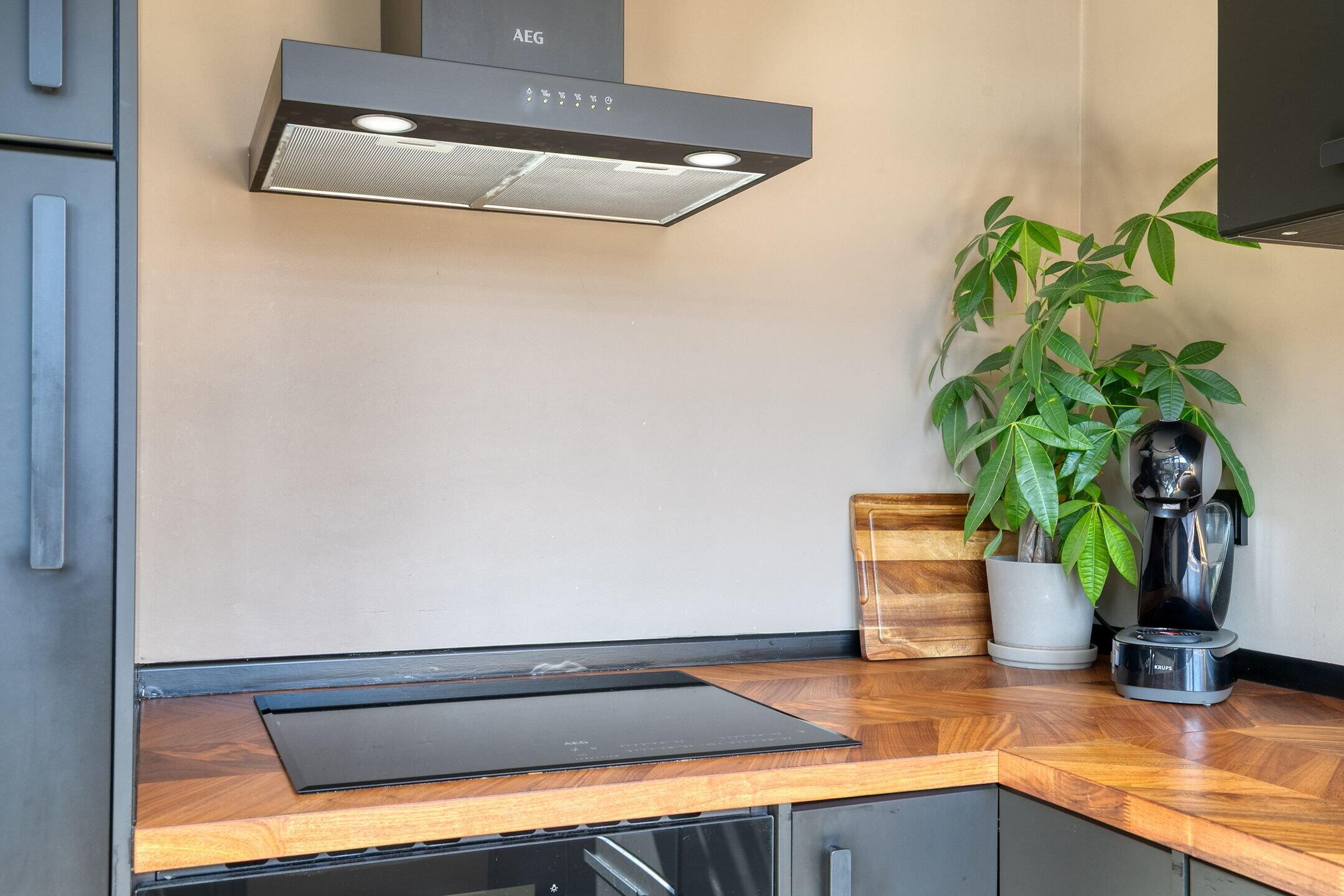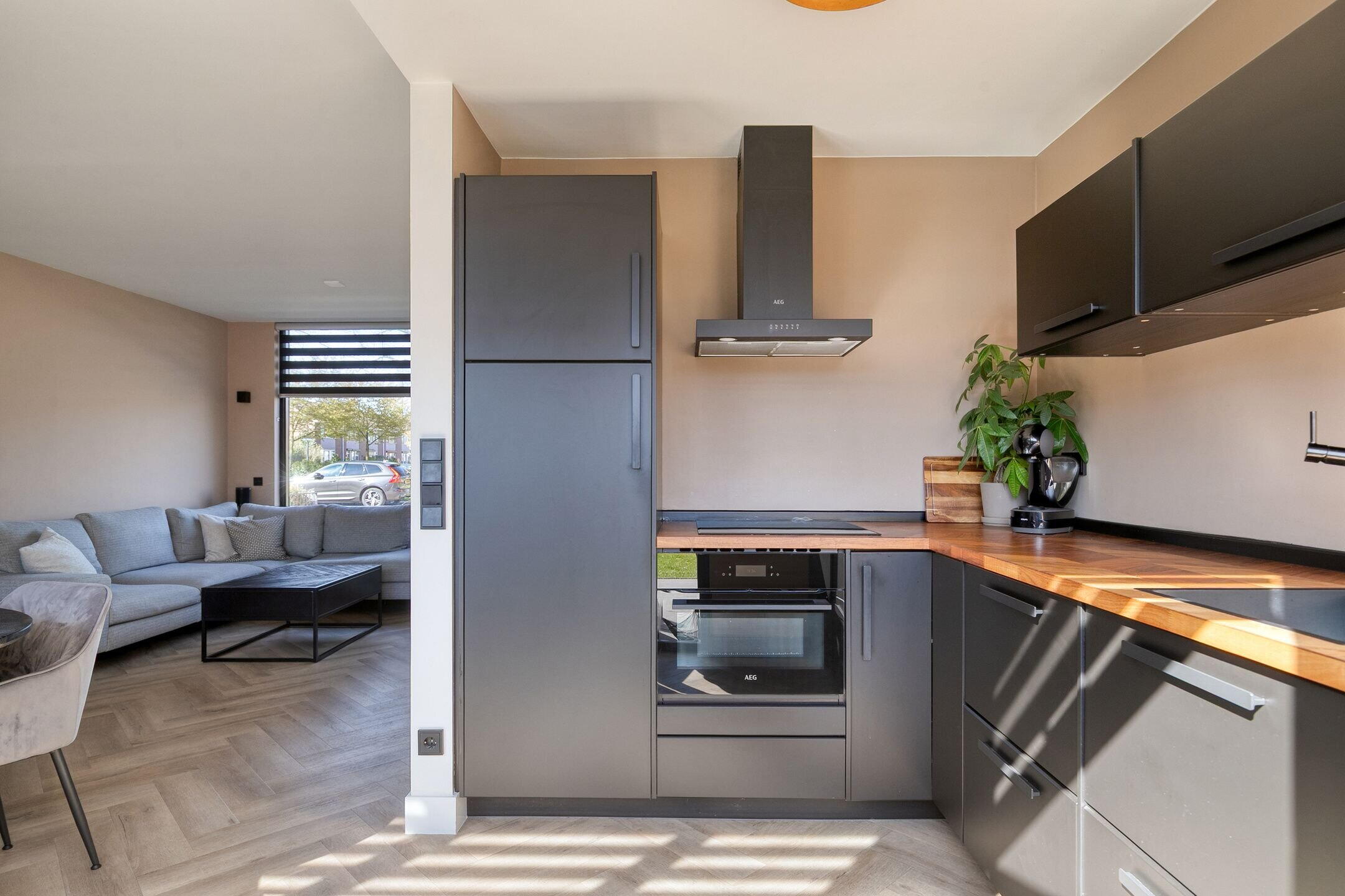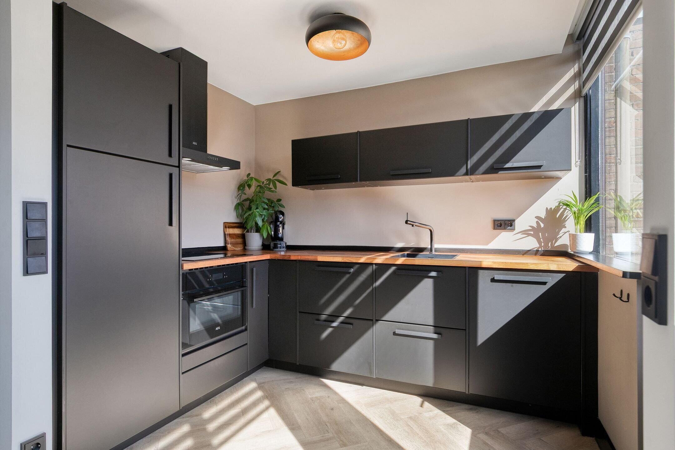 De open keuken (2022) is modern uitgevoerd in mat zwart met een houten werkblad en voorzien van hoogwaardige inbouwapparatuur (AEG), waaronder een inductiekookplaat, combi-oven, vaatwasser en koelkast. Vanuit de keuken heb je direct toegang tot de achtertuin.