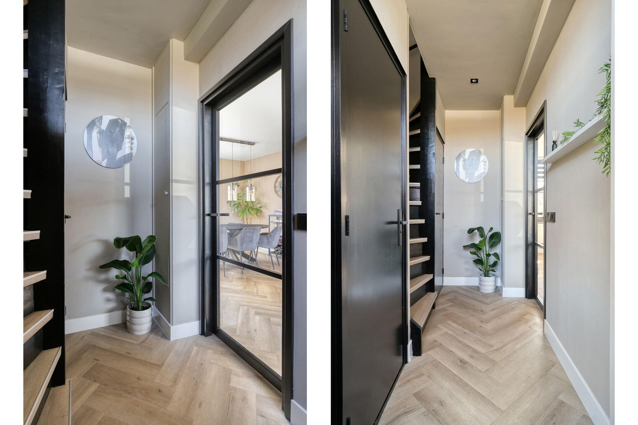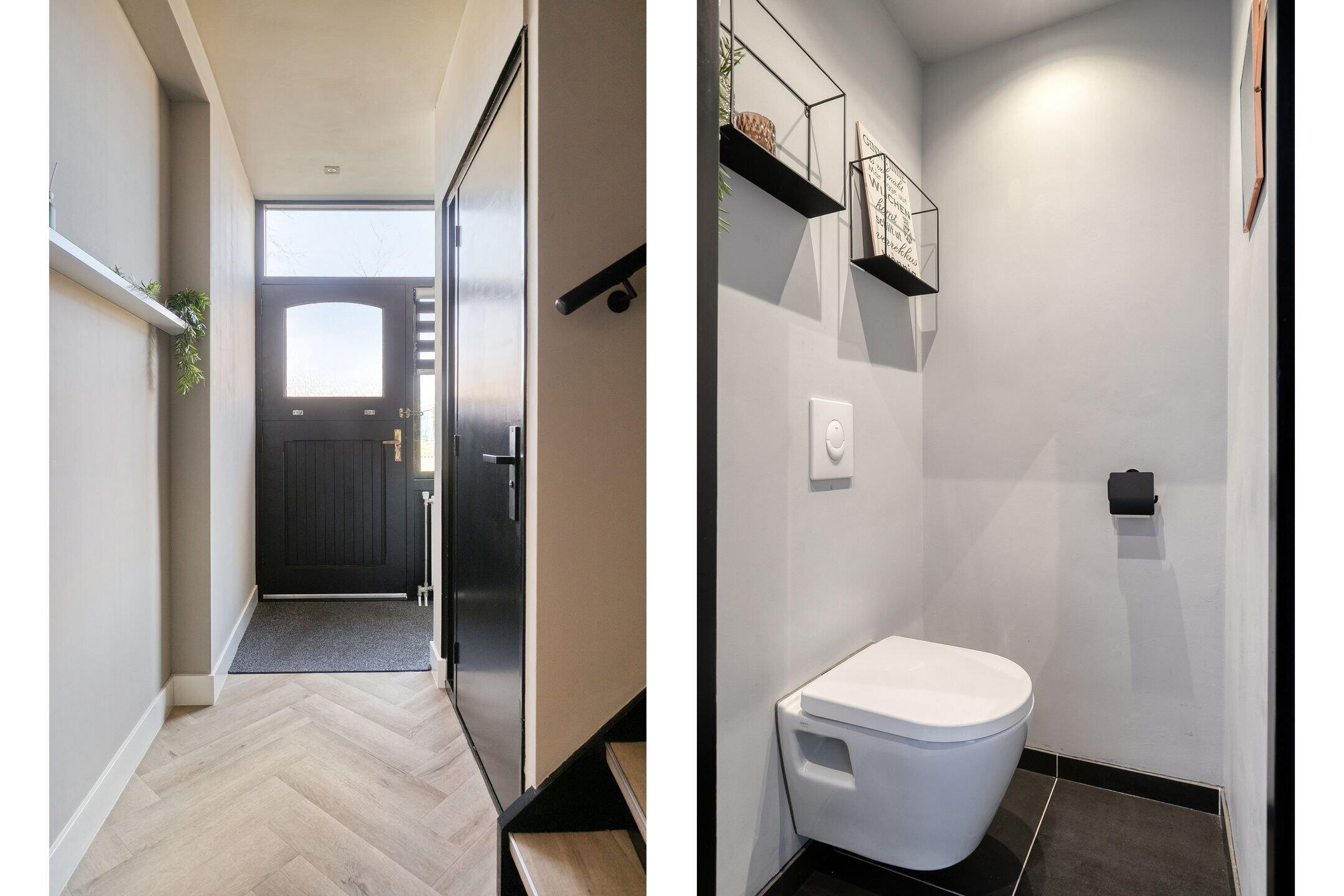 Via de karakteristieke voordeur kom je binnen in een sfeervolle hal met kapstokruimte en een grote droogloopmat. Vanuit hier heb je toegang tot het moderne toilet (voorzien van hangtoilet en automatische afzuiging), de praktische voorraadkast onder de trap (met vernieuwde meterkast en waterleidingsysteem) en de woonkamer.