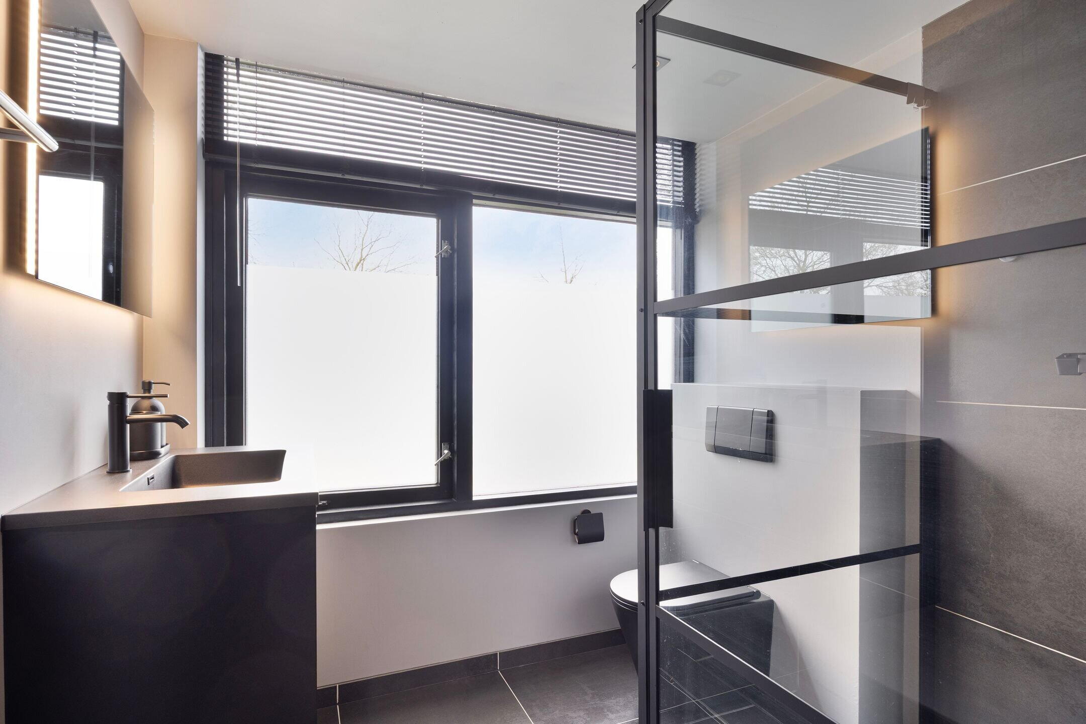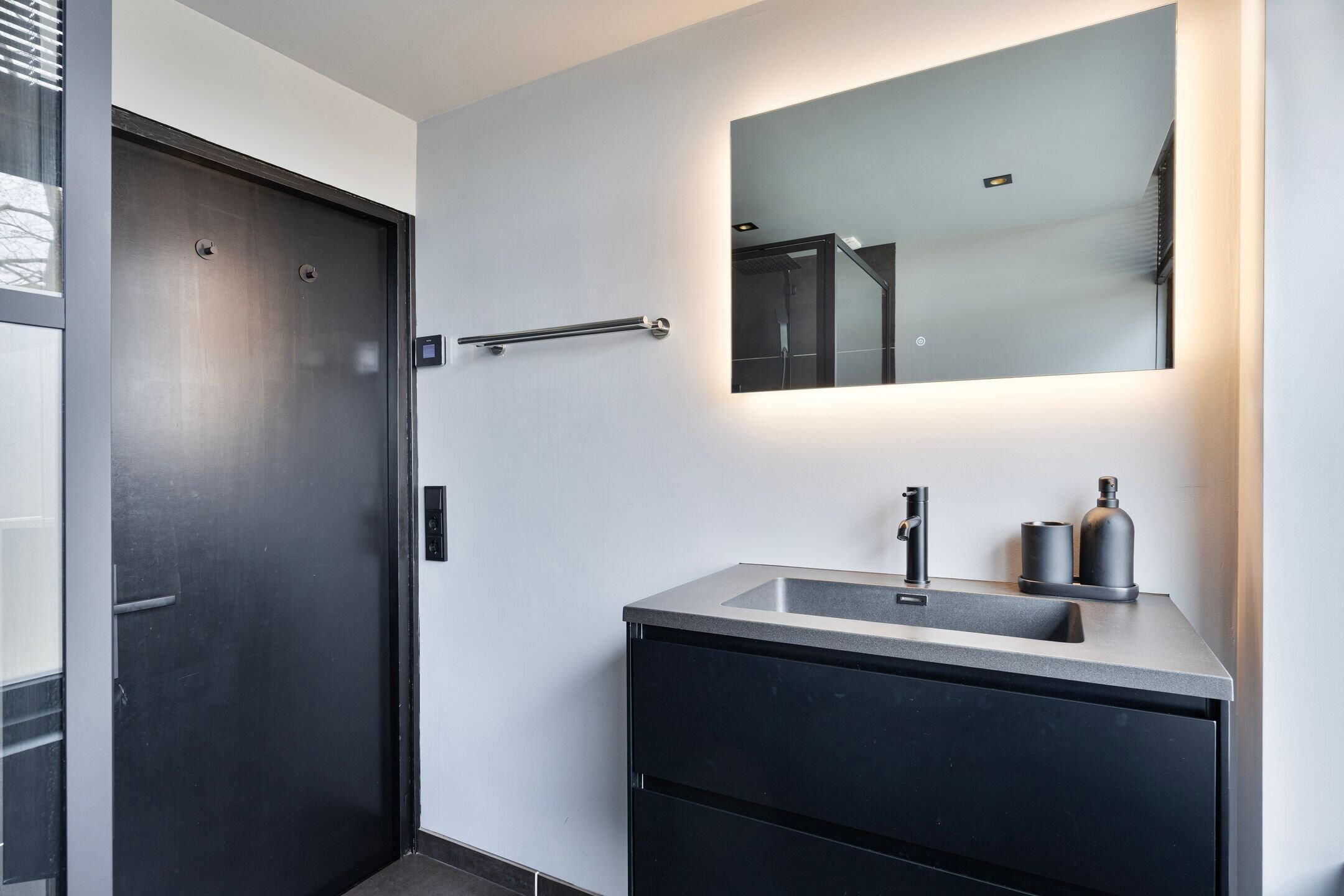 De moderne badkamer (2022) is uitgerust met een inloopdouche, wastafelmeubel, verlichte en verwarmde spiegel, een hangtoilet en elektrische vloerverwarming.